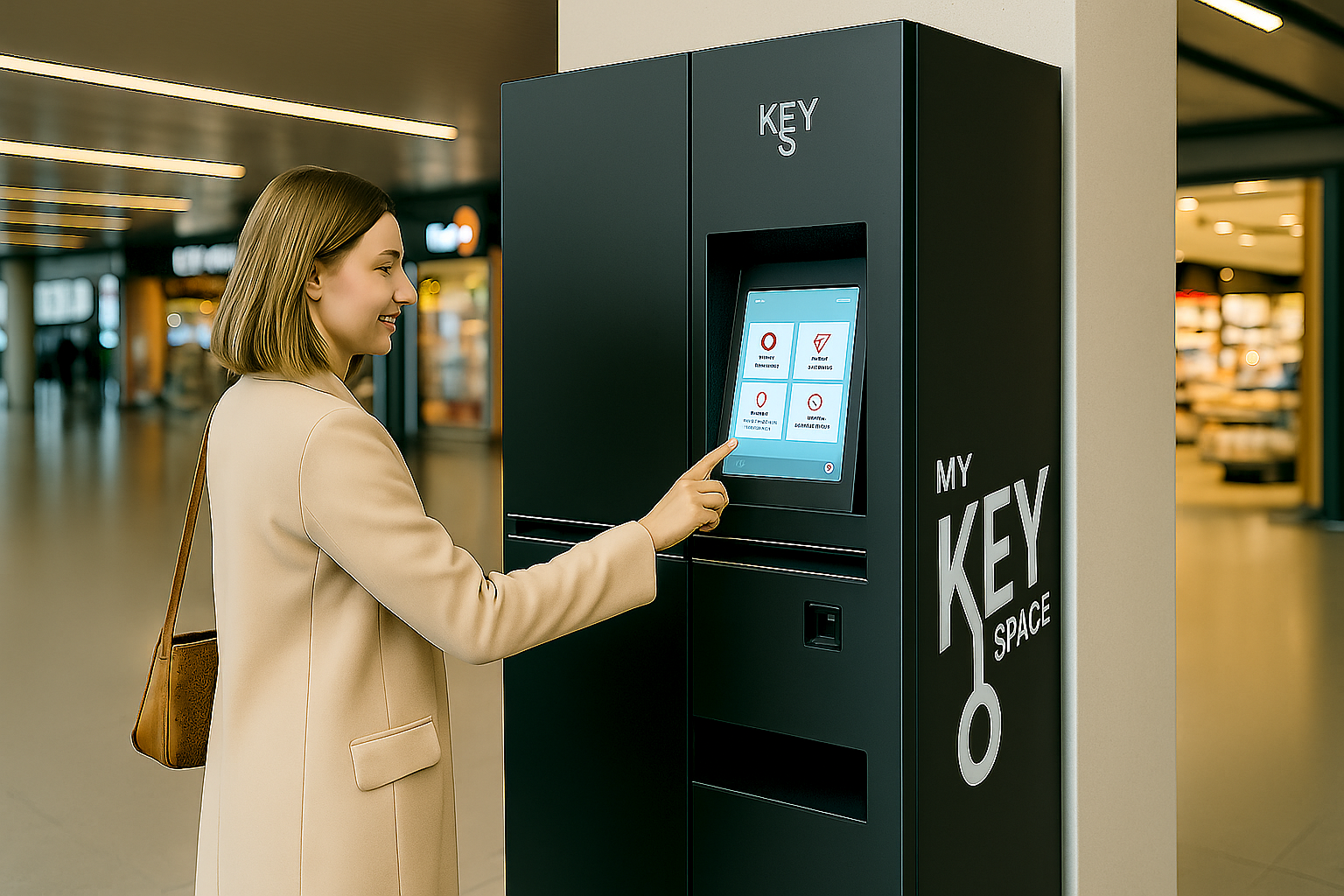Unsere Nutzerin hinterlegt ihren Wohnungsschlüssel im kiiwi-Automaten am Terminal. Ihr Mann holt ihn mithilfe eines Codes ab – ganz ohne persönlichen Kontakt.